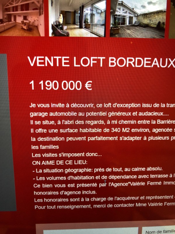 Actuellement, votre agence immobilière de proximité, Valérie de fermé immobilier, je vous propose à la vente d’un loft dans Bordeaux, quartier Saint-Bruno, près de la barrière judaïque.